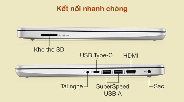 Dọc hai bên laptop là các cổng kết nối phổ biến hiện nay như 2 cổng SuperSpeed USB A, HDMI và USB Type-C hỗ trợ liên kết với các thiết bị ngoại vi tương thích như loa, chuột, máy in,… một cách dễ dàng và chính xác.